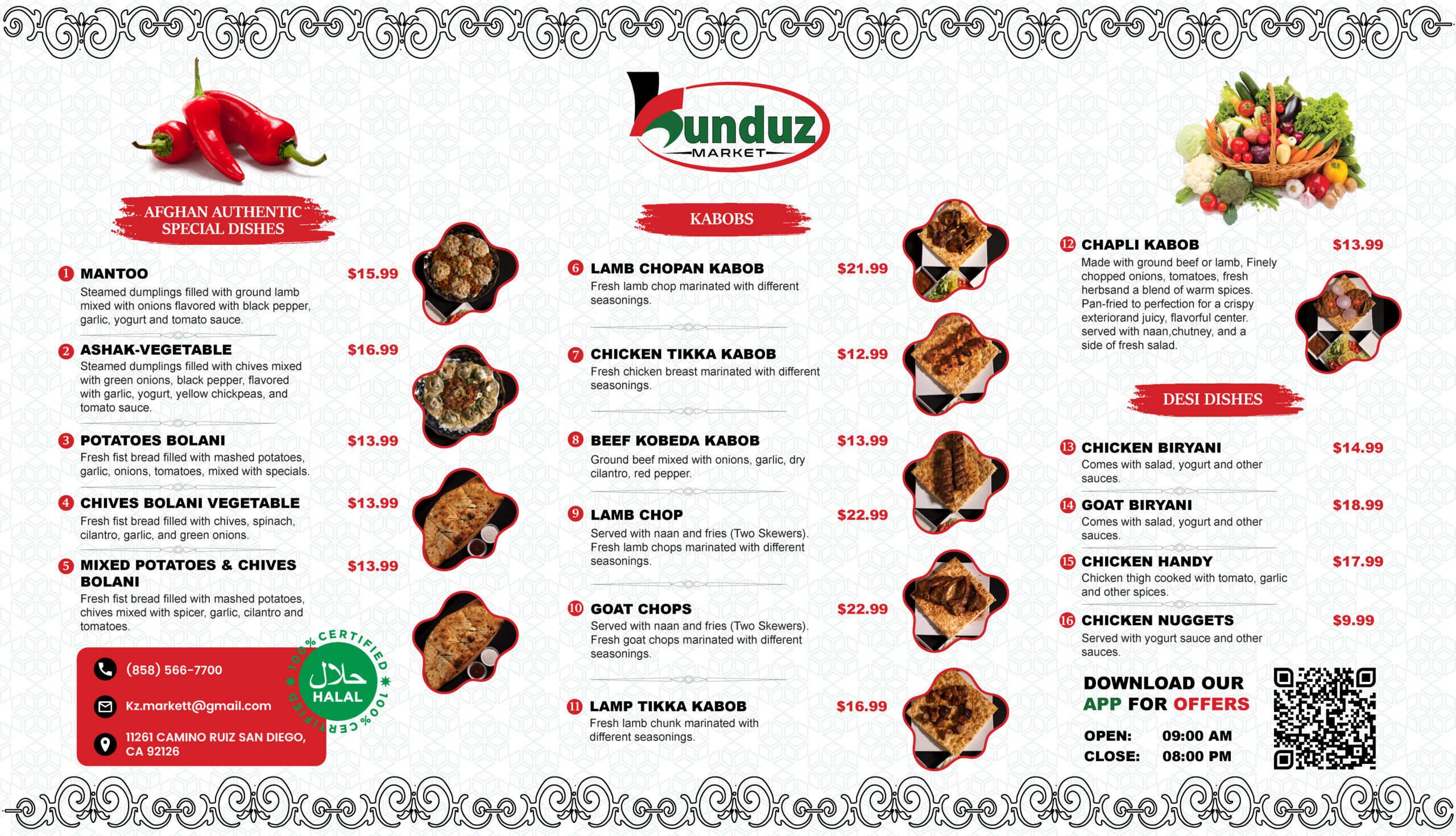Welcome to Kunduz Market Restaurant Menu, where great taste meets freshness and quality. Our restaurant offers a variety of delicious meals prepared with fresh and 100% halal ingredients sourced directly from our market. We focus on serving flavorful dishes made with care, ensuring every meal is both satisfying and memorable.